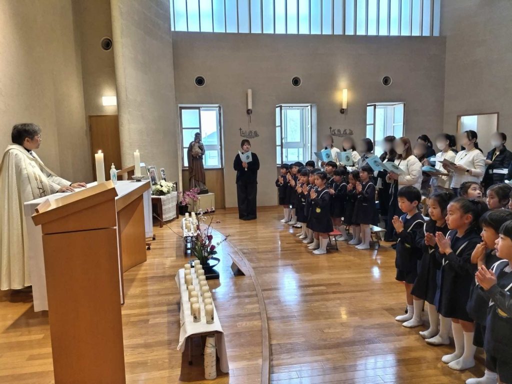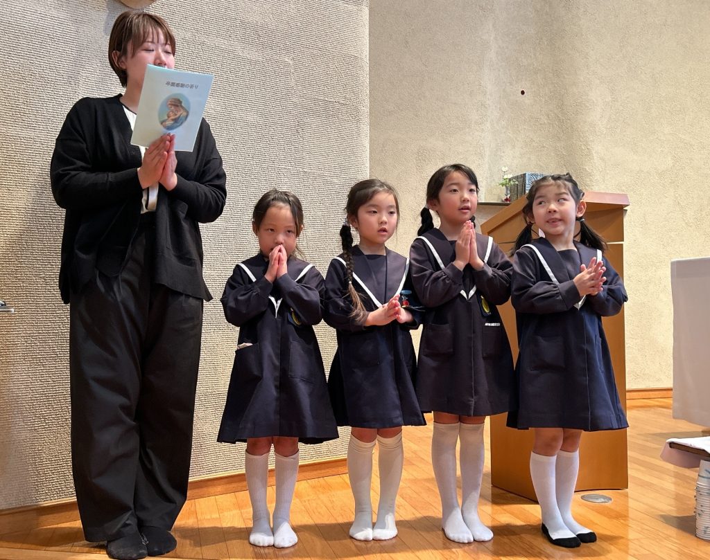 年長組が幼稚園の聖堂で、これまでいただいたお恵みに感謝の祈りをお捧げし、神父様から祝福をいただきました。