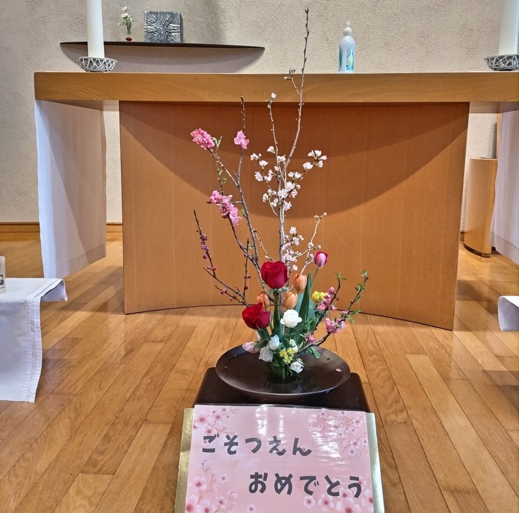 まだサレジオ幼稚園が「星美幼稚園」という名前の時に卒園された方が、年長組の卒園を祝って生けて下さいました。